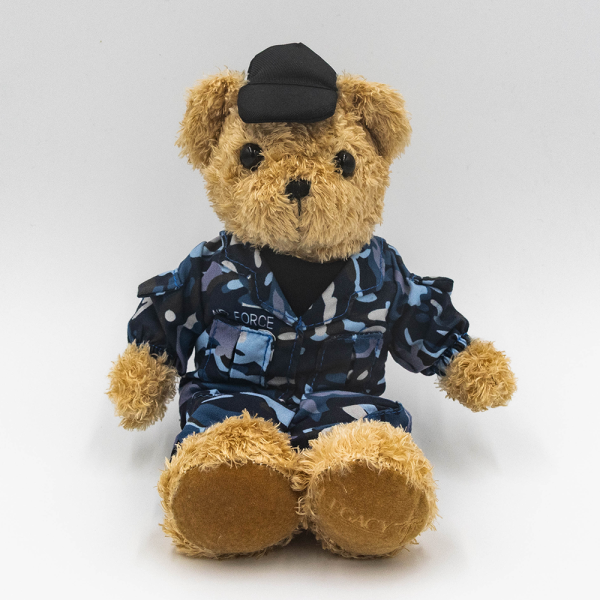 Plush Legacy Bear wearing blue Air Force camouflage uniform. Dimensions: Approx 25cm (H)